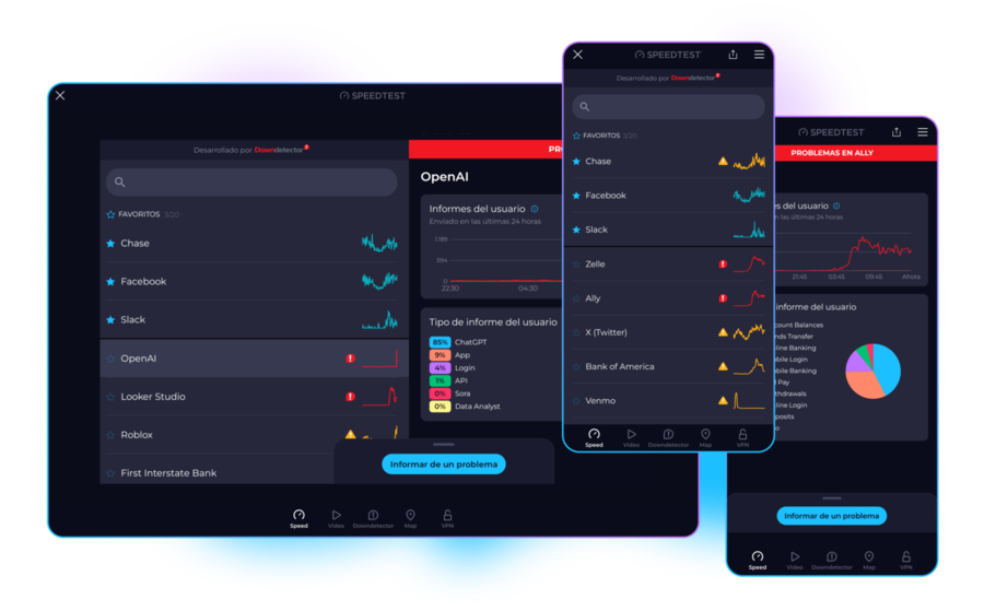 Monitoree e informe de los problemas de sus servicios favoritos en tiempo real a través de Downdetector, la plataforma más popular del mundo para el seguimiento de cortes y problemas de conectividad.